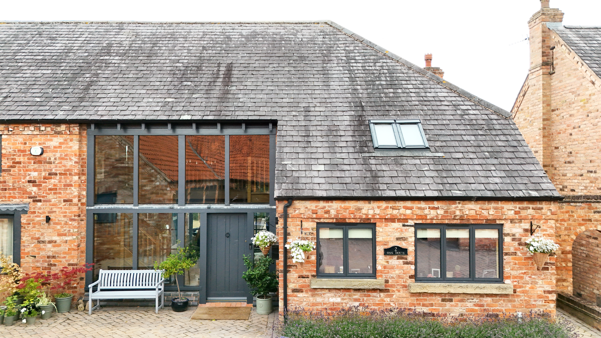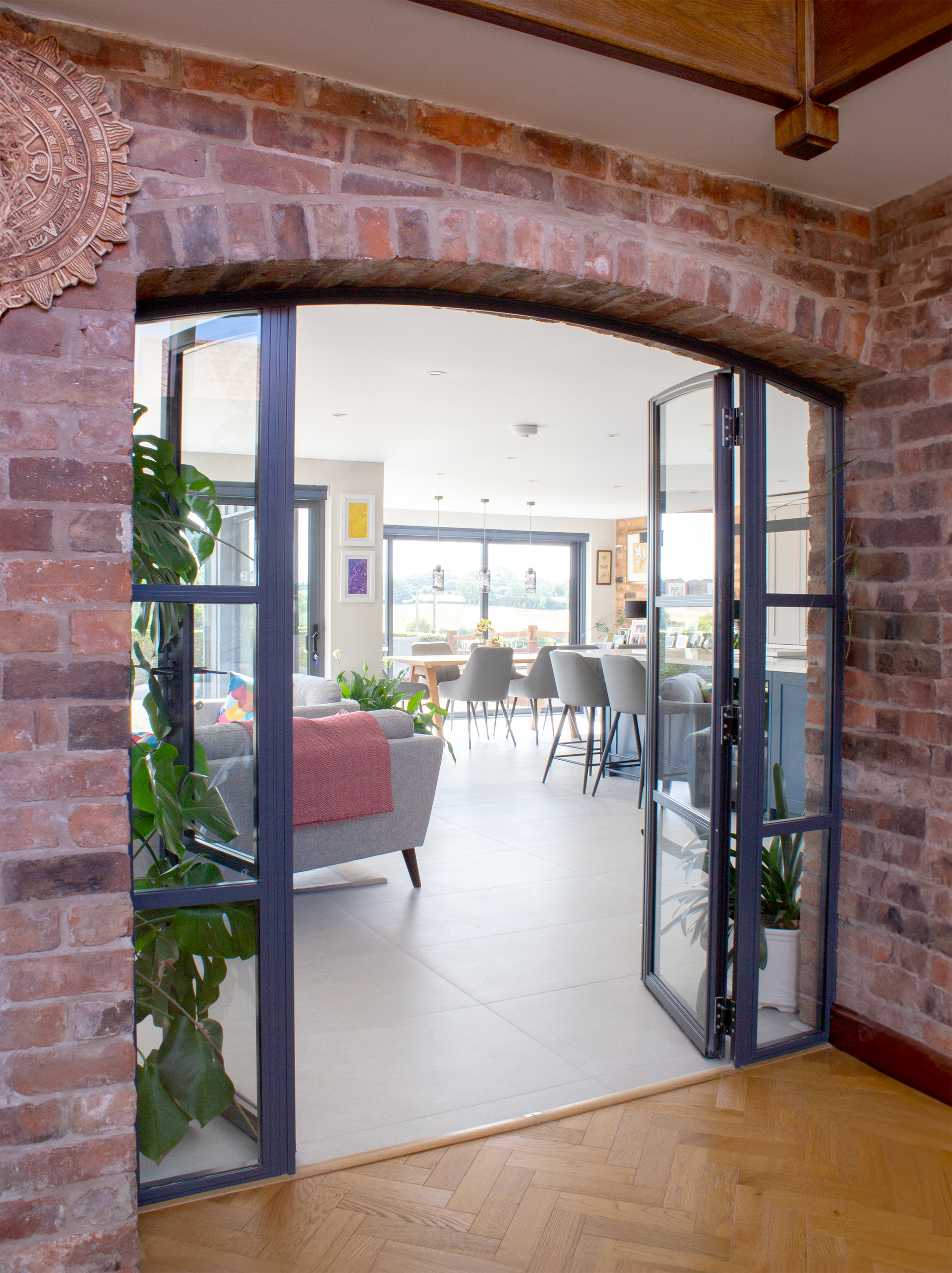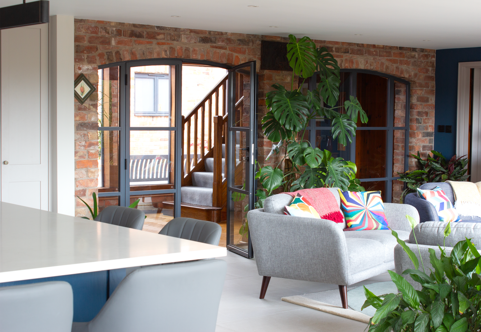 Internally, the project features a bright open-plan kitchen, dining and living space, centred around the newly formed extension. Exposed brick walls celebrate the building’s agricultural heritage, while black-framed glazed screens and doors introduce a refined industrial character. These glazed partitions allow daylight to filter deep into the plan while maintaining visual separation between spaces whilst linking old and new through material continuity.