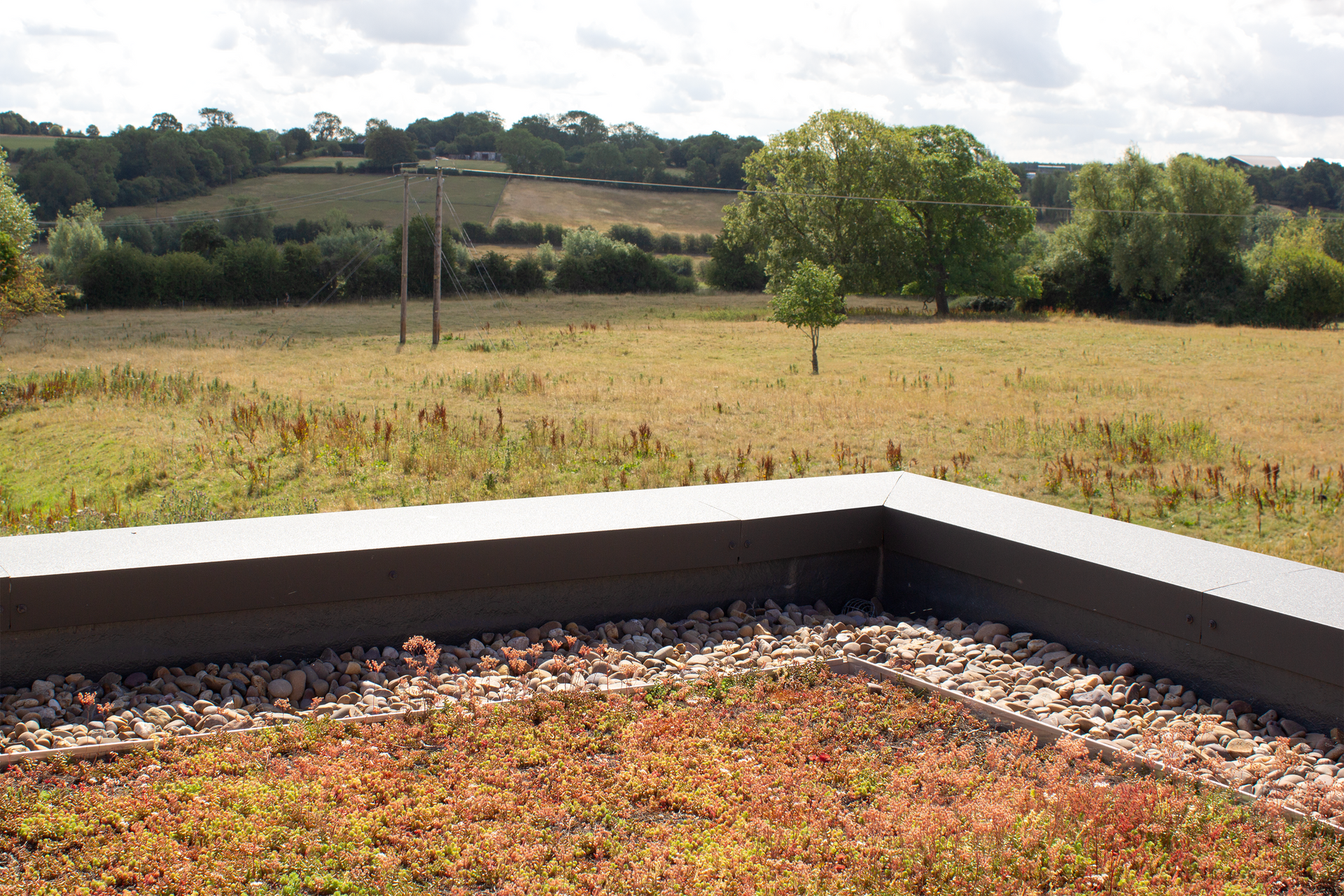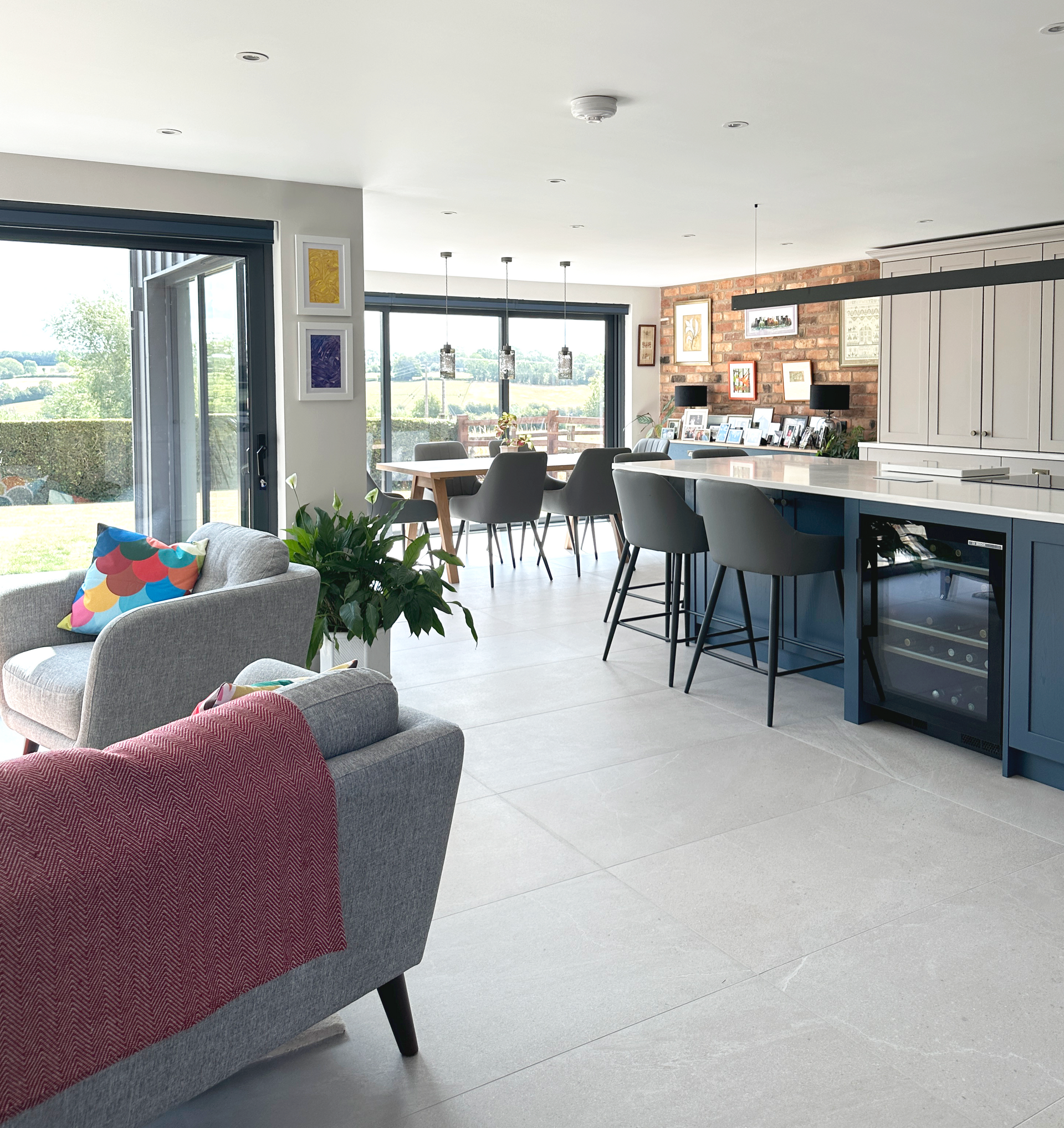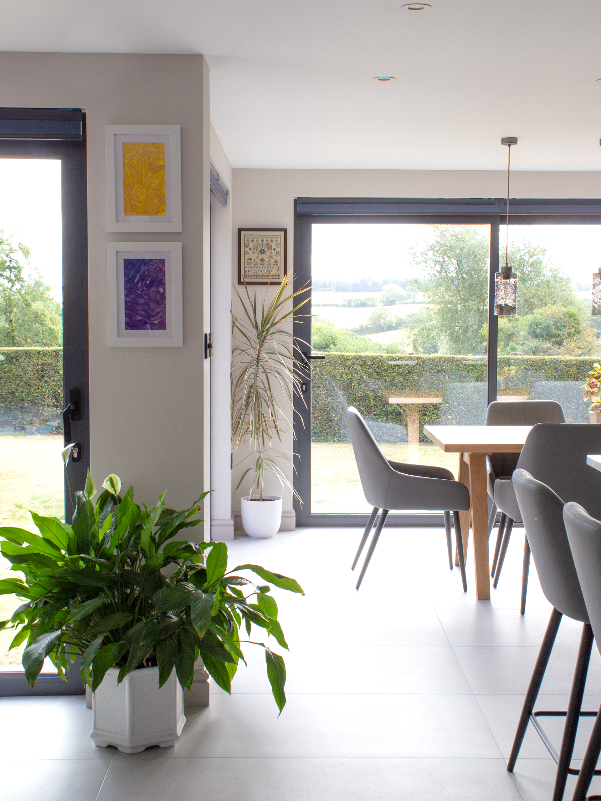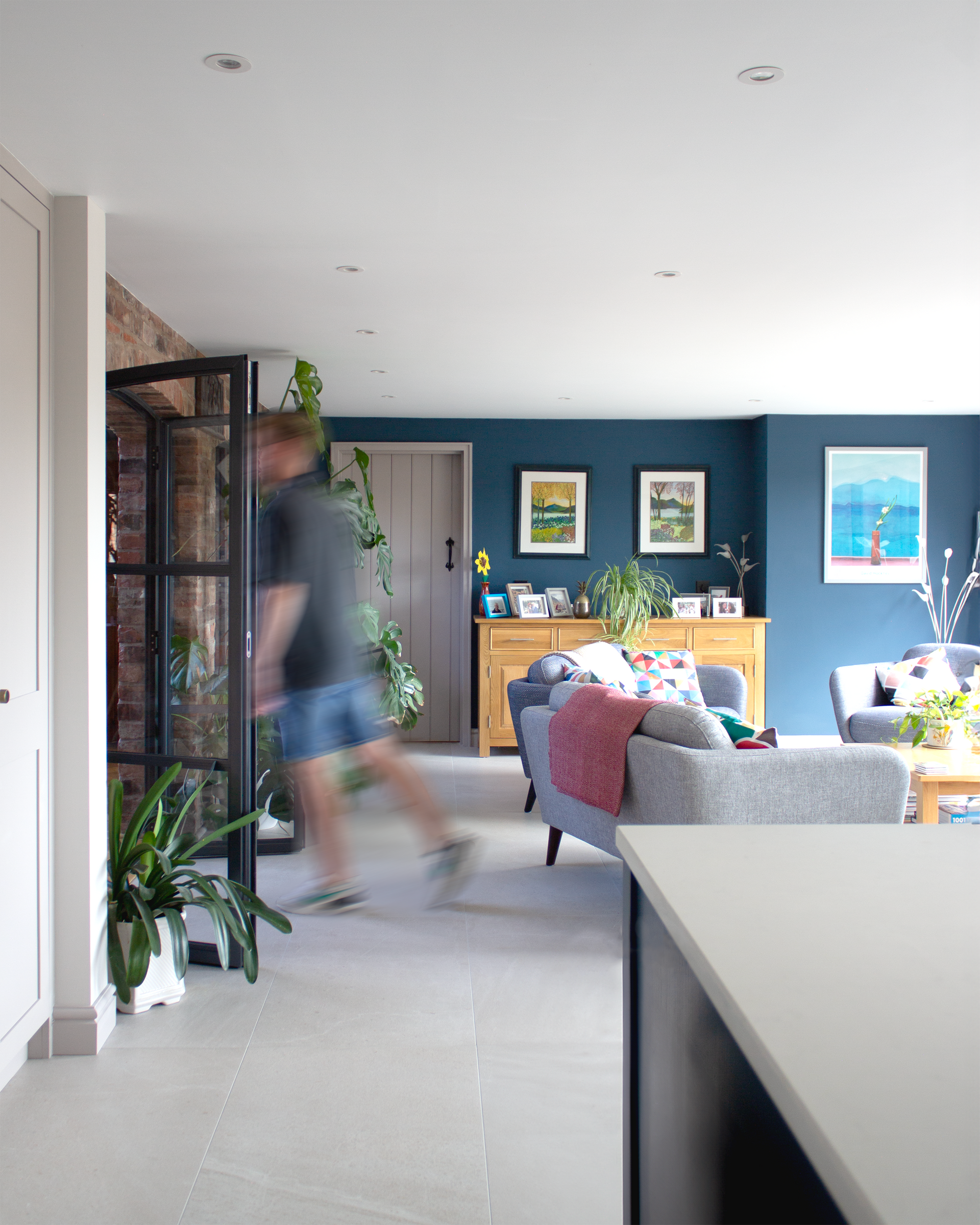 Internally, the project features a bright open-plan kitchen, dining and living space, centred around the newly formed extension. Exposed brick walls celebrate the building’s agricultural heritage, while black-framed glazed screens and doors introduce a refined industrial character. These glazed partitions allow daylight to filter deep into the plan while maintaining visual separation between spaces whilst linking old and new through material continuity.