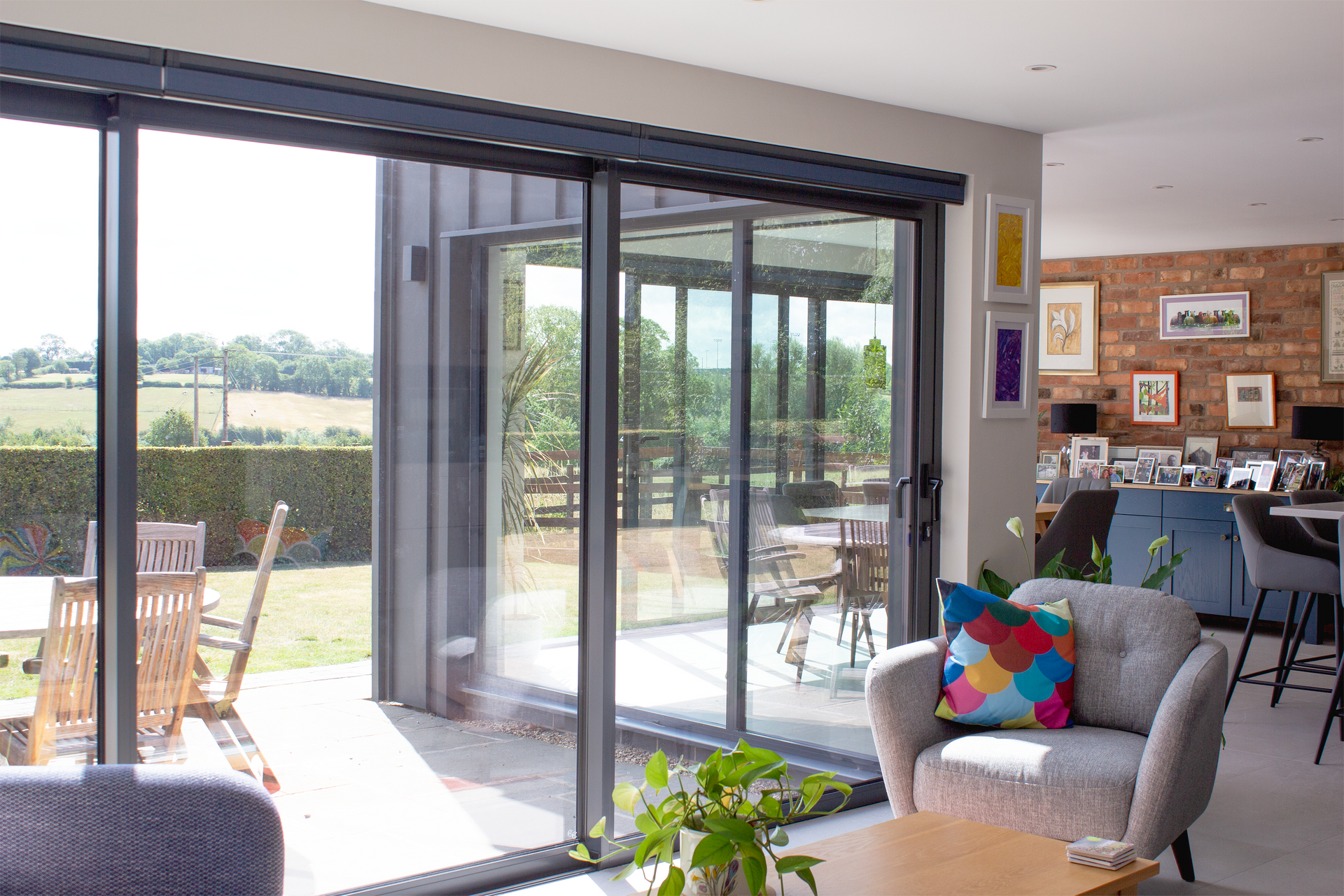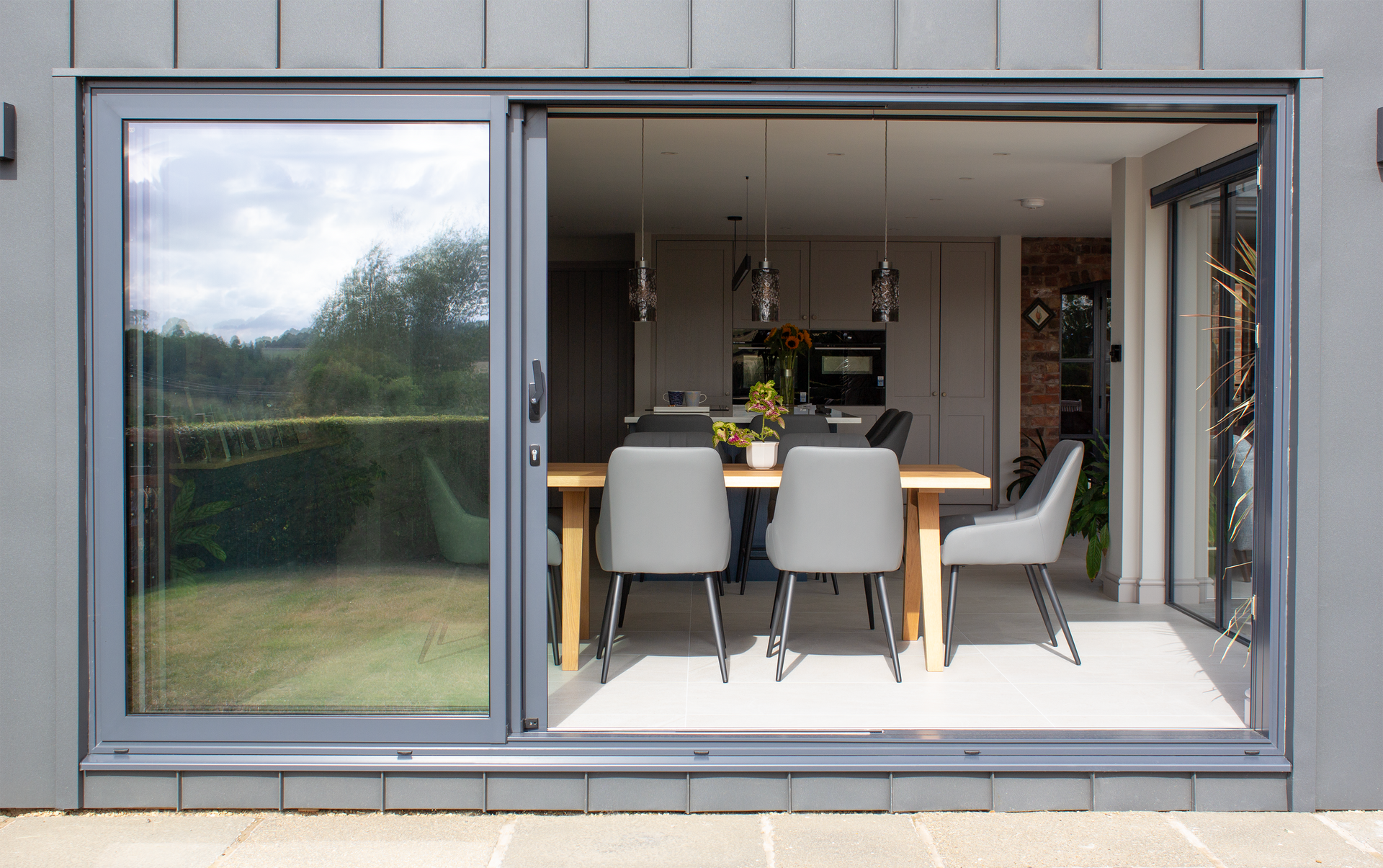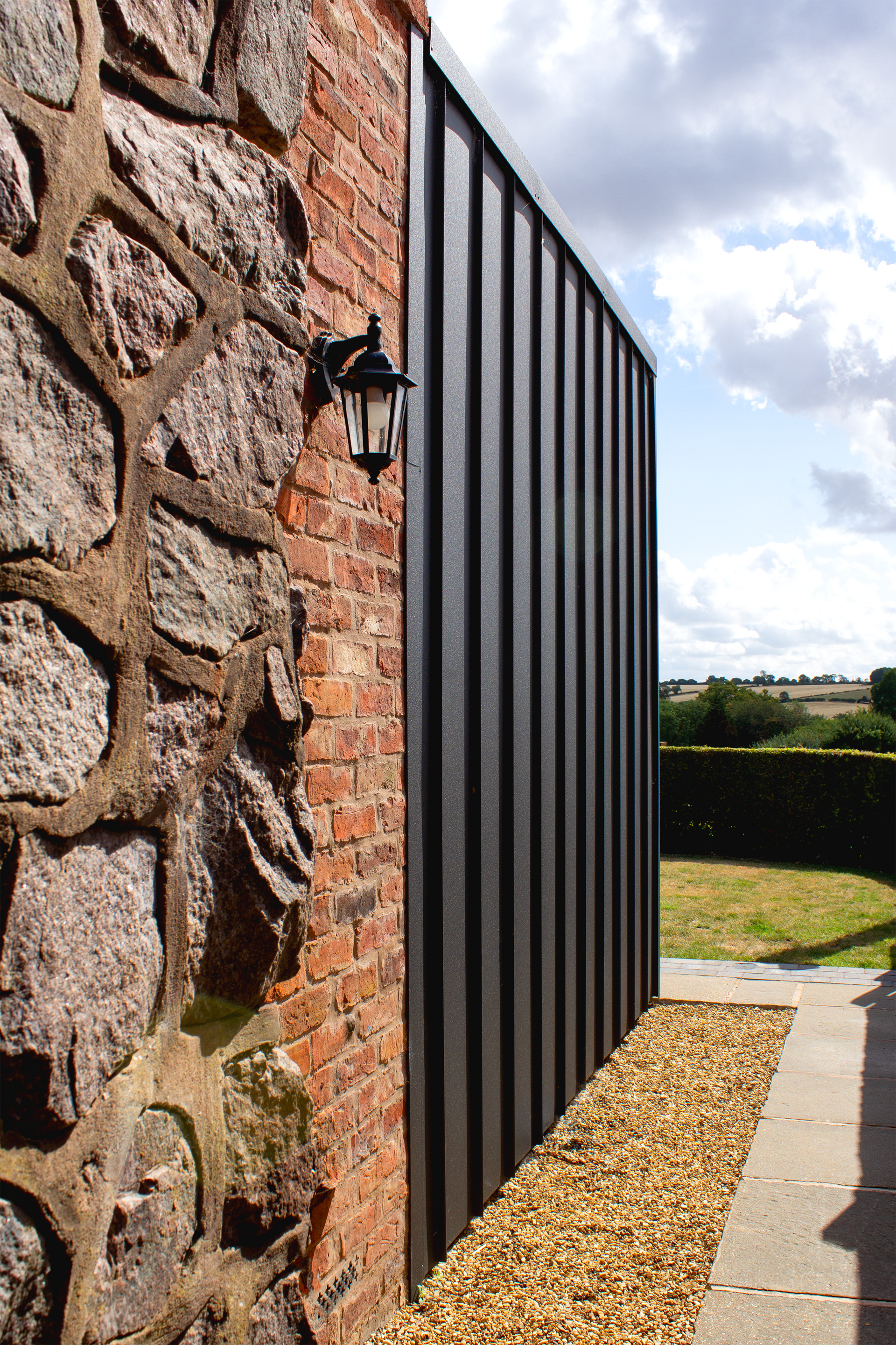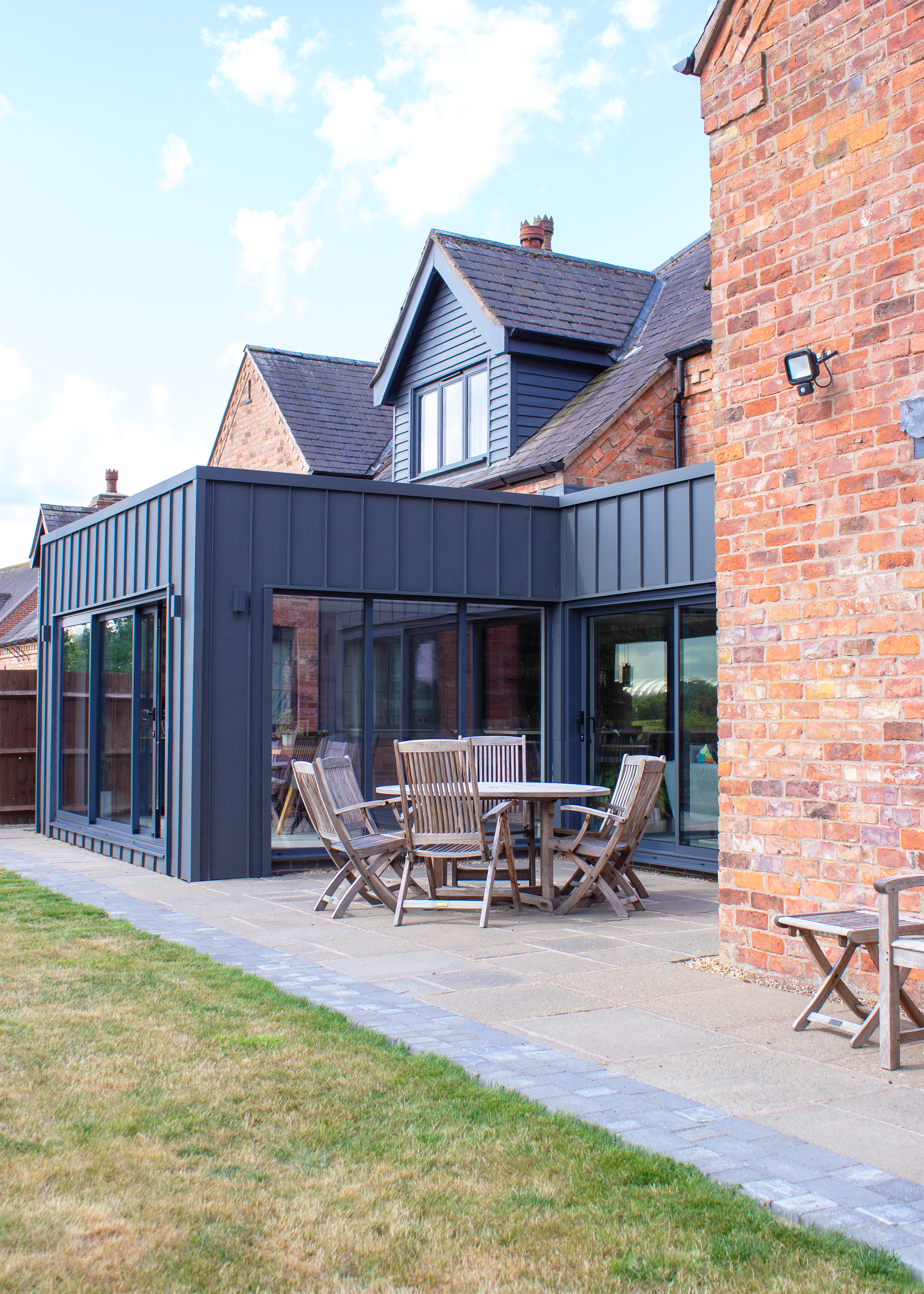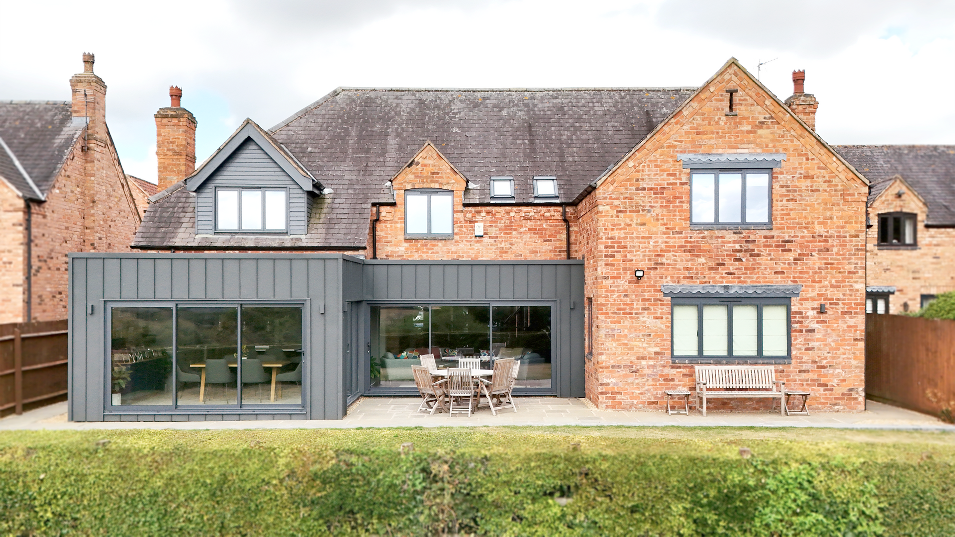 From the garden, the new contemporary rear extension is expressed in muted grey standing-seam cladding and large-format glazing, providing a clear architectural contrast to the original red brick farmhouse. This modern addition opens the home to the landscape, creating a strong visual and physical connection between the internal living spaces and the garden beyond. Generous sliding doors enhance natural light and support fluid indoor-outdoor living.
